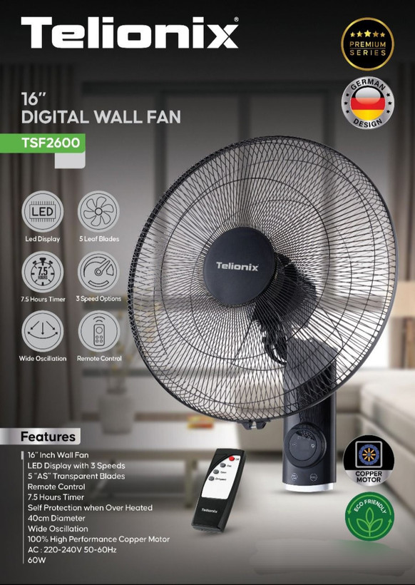 پنکه دیواری ۱۶ اینچ _ نمایشگر الایدی با ۳ سرعت _ ۵ پره شفاف _ کنترل از راه دور _ تایمر ۷.۵ ساعته _ محافظت در برابر گرمای بیش از حد _ قطر ۴۰ سانتیمتر _ موتور مسی ۱۰۰٪ با کارایی بالا