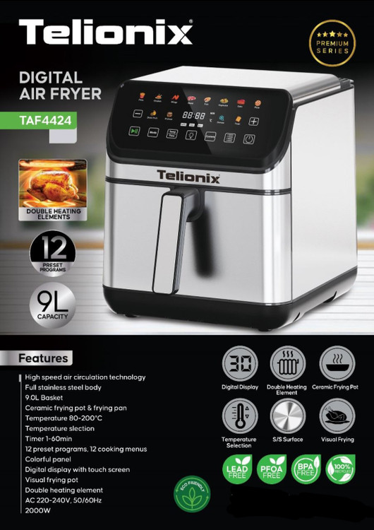 تکنولوژی گردش هوا با سرعت بالا _ دما ۸۰ تا ۲۰۰ درجه سانتیگراد _ زمان یک تا ۶۰ دقیقه _ ۱۲ برنامه از پیش تعیین شده _ پنل لمسی و رنگی _ تا ۸۰ درصد چربی کمتر